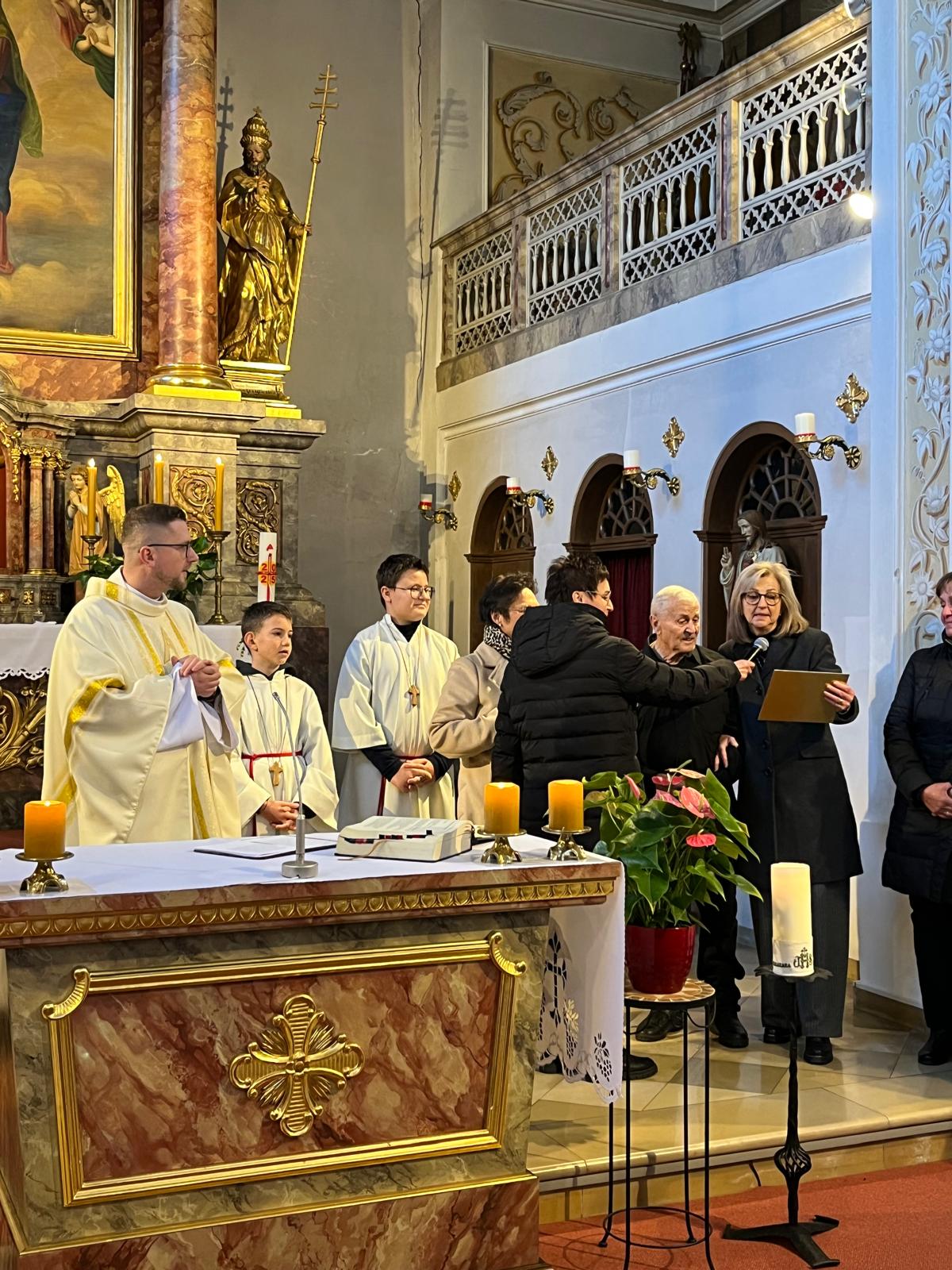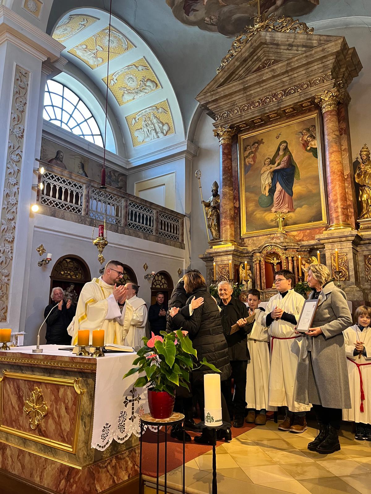 Ein Höhepunkt einer Cäciliafeier sind die Ehrungen von fleißigen Sängerinnen und Sängern. So wurden Julia Geisler für 35 Jahre und Helga Blunder für 25 Jahre Mitgliedschaft ausgezeichnet. Unglaubliche 75 Jahre beim Kirchenchor und 70 Jahre an der Orgel ist unser Franz Angerer. Dafür gab es eine herzliche Gratulation und viel Lob von unserem Pfarrer Piotr: „Lieber Franz, dafür dass du gemäß der Lehre Jesu deine Talente nicht in der Erde versteckt und vergraben hast, sondern im Gegenteil, sie ständig vermehrst, indem du zu seiner Ehre und unserer Freude spielst und singst, dafür dass du dabei keine Mühen scheust und dafür, dass wir uns auf dich verlassen können, möchten wir dir heute danken.“ Im Jahre 2026 soll es dann auch noch eine diözesane Auszeichnung, das Verdienst- und Ehrenzeichen für Franz geben.