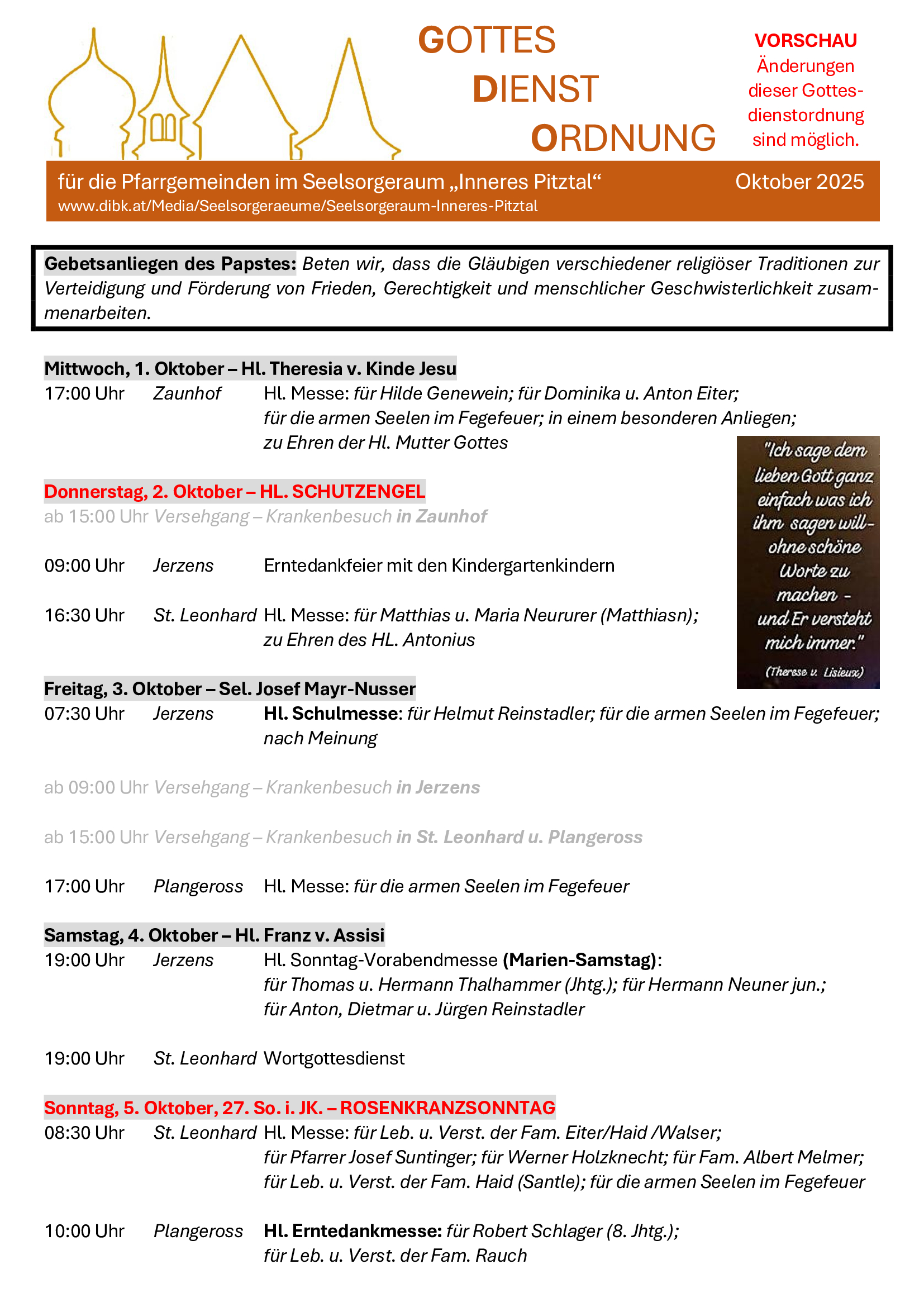 Die vier Kirchengemeinden des inneren Pitztals sind momentan auf dem Weg: auf einem Weg, der noch mehr das Zusammenleben, das Zusammenfeiern, das Zusammenglauben erlebbar machen möchte, ganz einfach deshalb, weil sich kirchliches Leben auch bei uns in den letzten Jahren sehr verändert hat und sich noch mehr verändern wird. Als Seelsorgeraum versuchen wir eine momentane Antwort auf diese strukturelle, den veränderten Lebensgewohnheiten angepasste, Veränderung zu geben.
