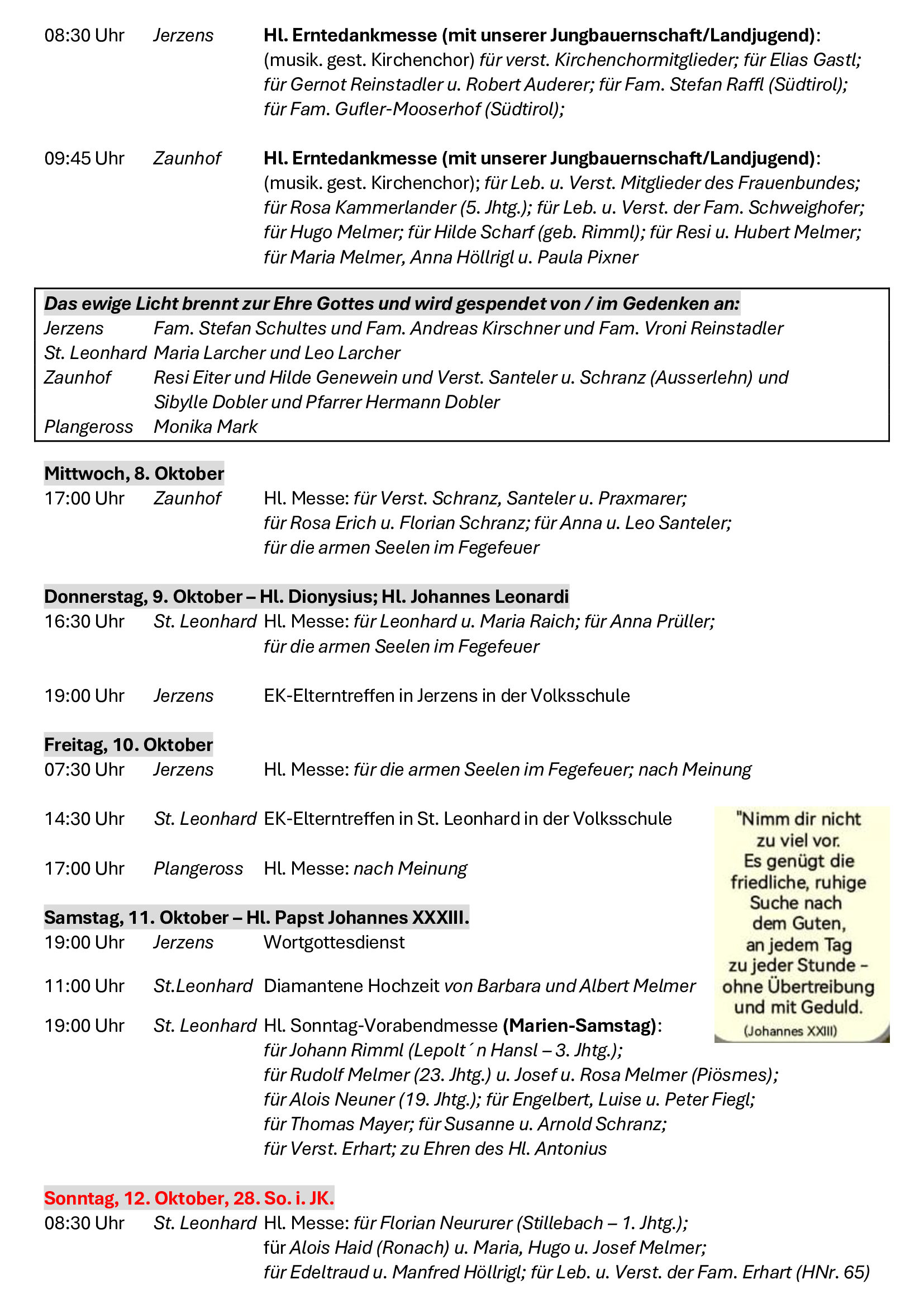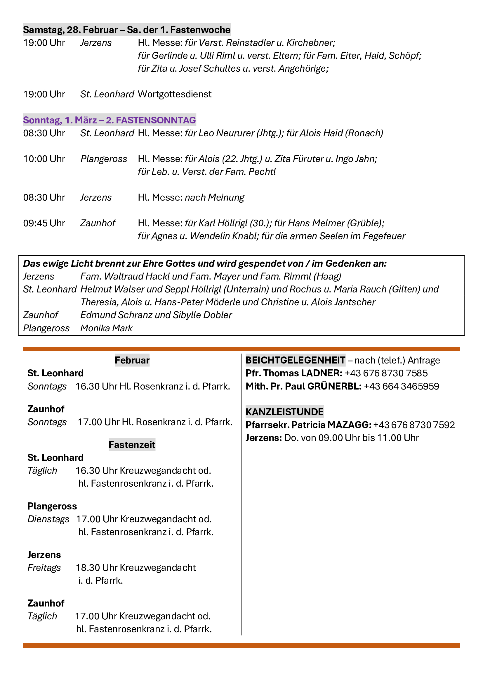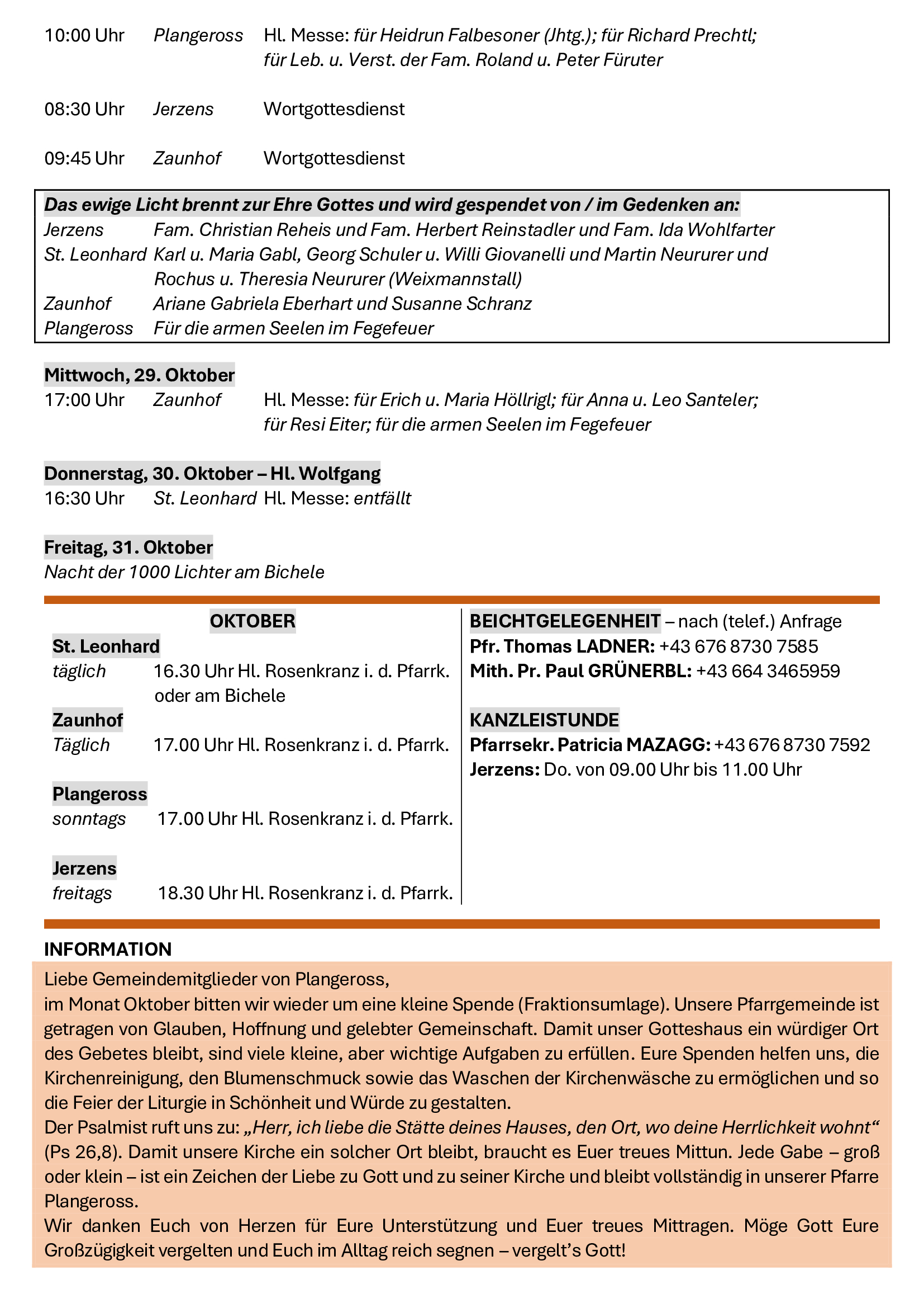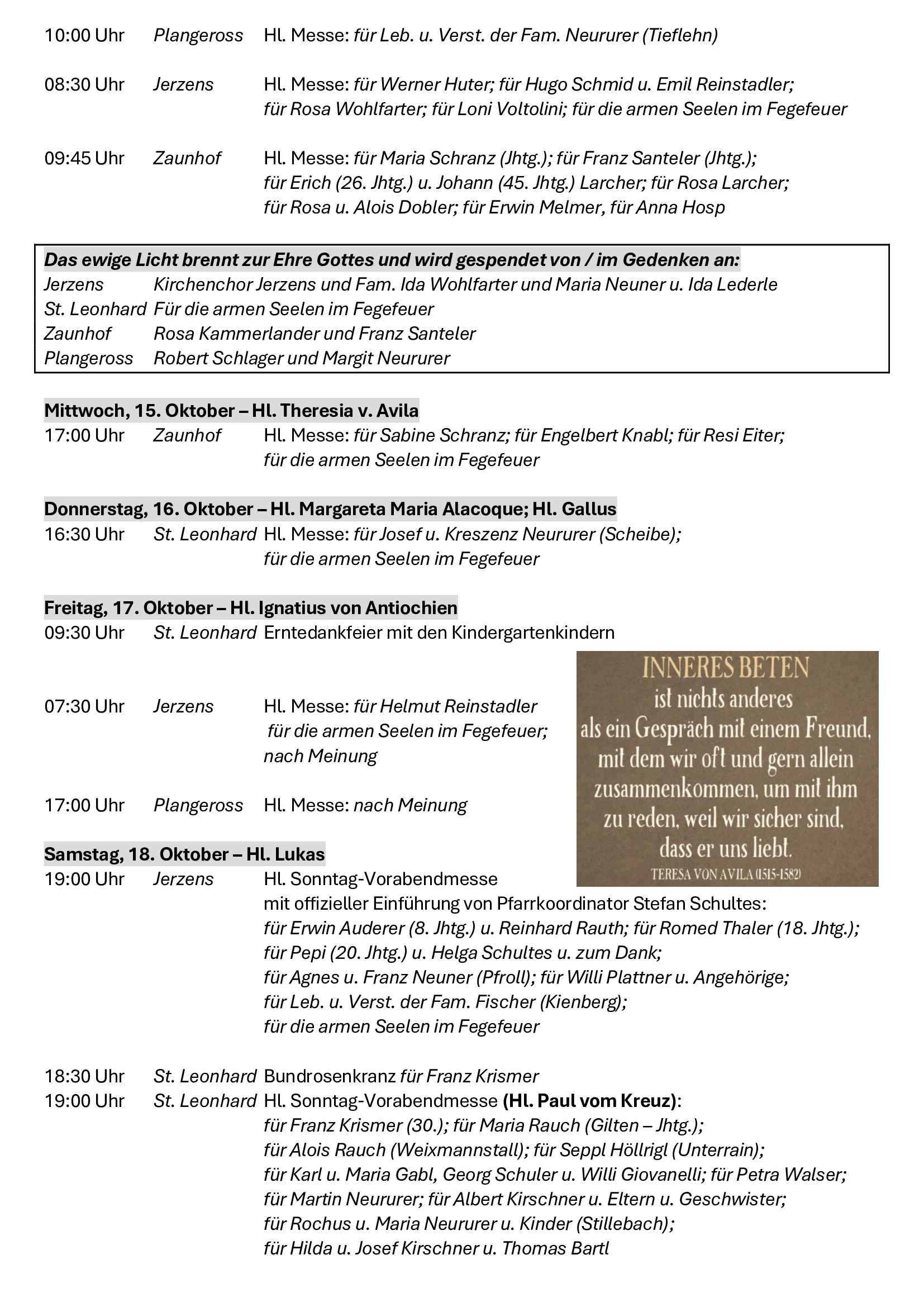 Neben all den äußeren Herausforderungen bleibt der Grundauftrag für jede unserer vier Kirchengemeinden der Auftrag Jesu, das Reich Gottes im konkreten Alltag zu suchen und umzusetzen. „Euch soll es zuerst um Gottes Reich und Gottes Gerechtigkeit gehen, dann wird er euch alles Übrige dazugeben.“ (Mt 6,33). Ich freue mich als zuständiger Pfarrer mit den Gläubigen vor Ort und mit den Gästen, die bei uns Erholung suchen, auf dem Weg zu sein, dem Reich Gottes nachzuspüren und ihm vielleicht auch eine konkrete Gestalt zu geben.