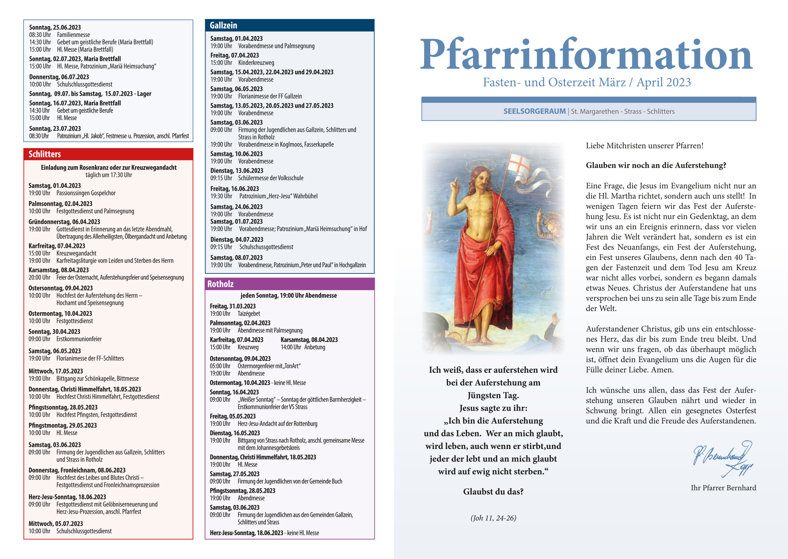 Die Gottesdienstordnungen und Pfarrbriefe des Seelsorgeraumes und die Gottesdienstordnungen können Sie auf der homepage der jeweiligen Pfarre downloaden.