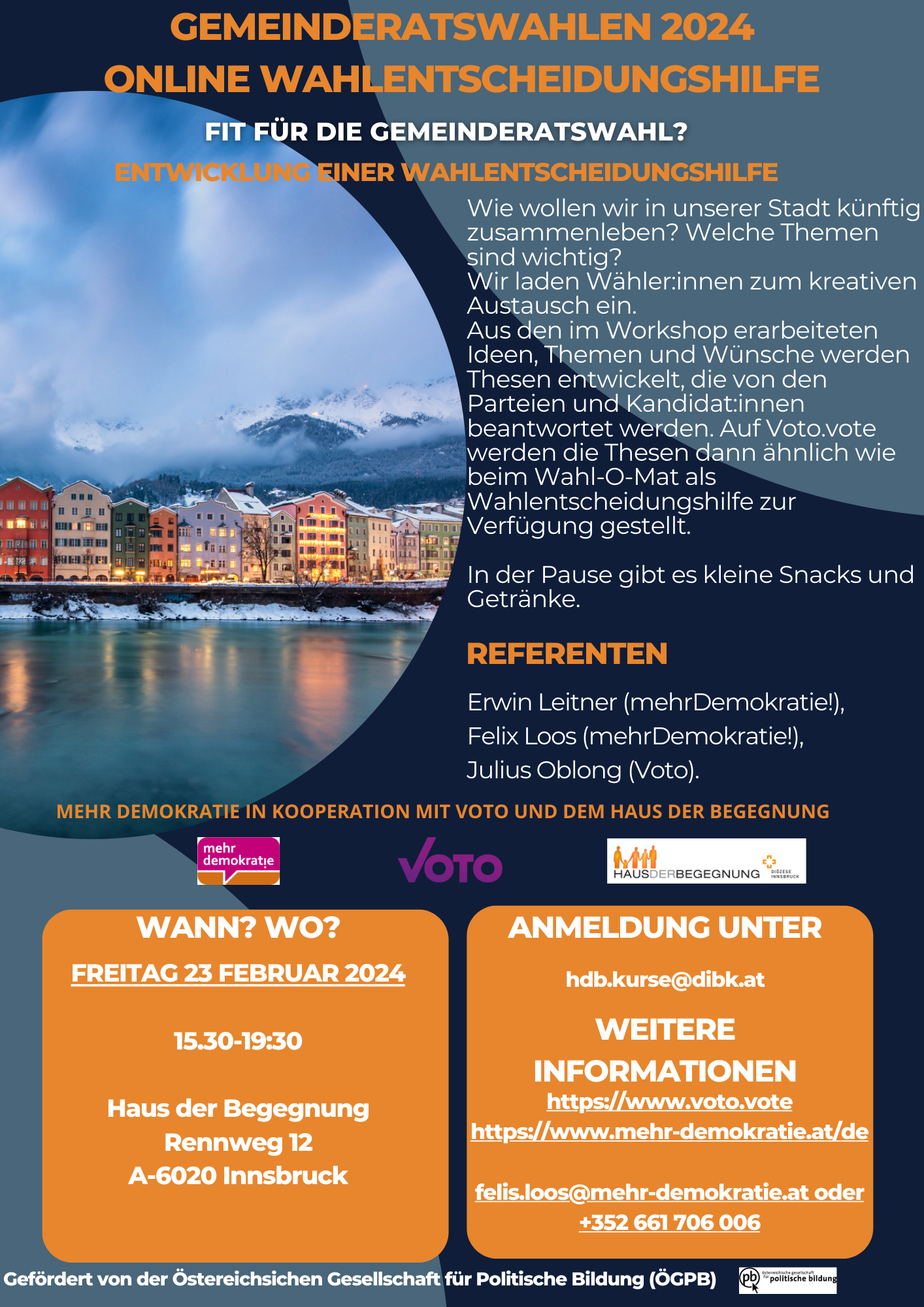 Gemeinsam mit mehr demokratie! www.mehr-demokratie.at ; VOTO https://www.voto.vote  und dem Institut für Politikwissenschaft der Universität Innsbruck