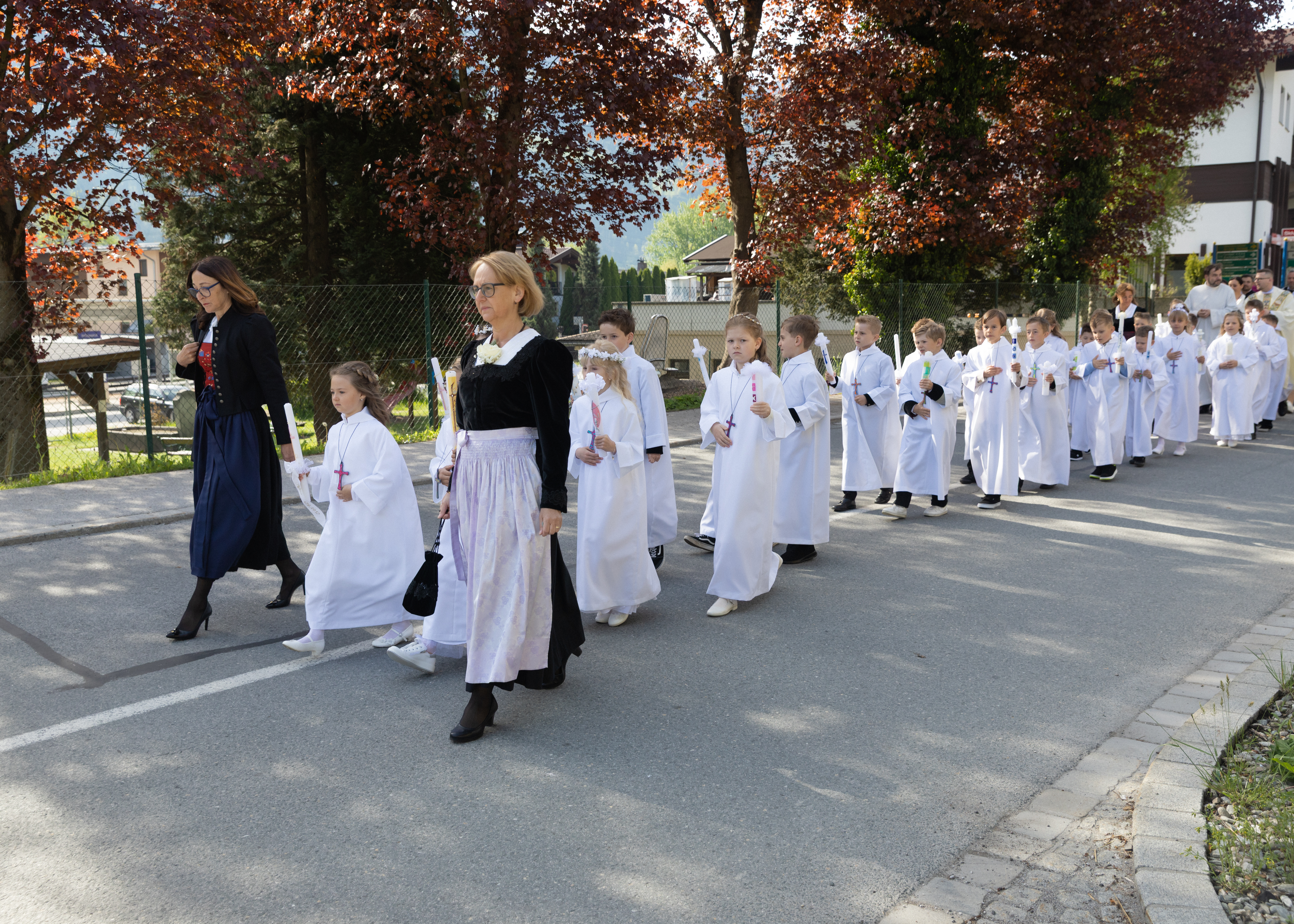 Am großen Tag zogen die Kinder feierlich in Begleitung ihrer Paten, Eltern, Geschwister und Verwandten von der Schule/Dorfplatz in die Kirche ein. Dabei wurden sie auch von der Musikkapelle begleitet. In der Kirche sangen die Erstkommunionkinder voll Freude, sie waren durch das Lesen der Texte (Kyrie, Lesung, Fürbitten, Dank) in den gesamten Gottesdienst miteingebunden. Dabei wurden sie von ihren Mitschülern und Lehrerinnen unterstützt. Die ganze Pfarrgemeinde freute sich mit ihnen.