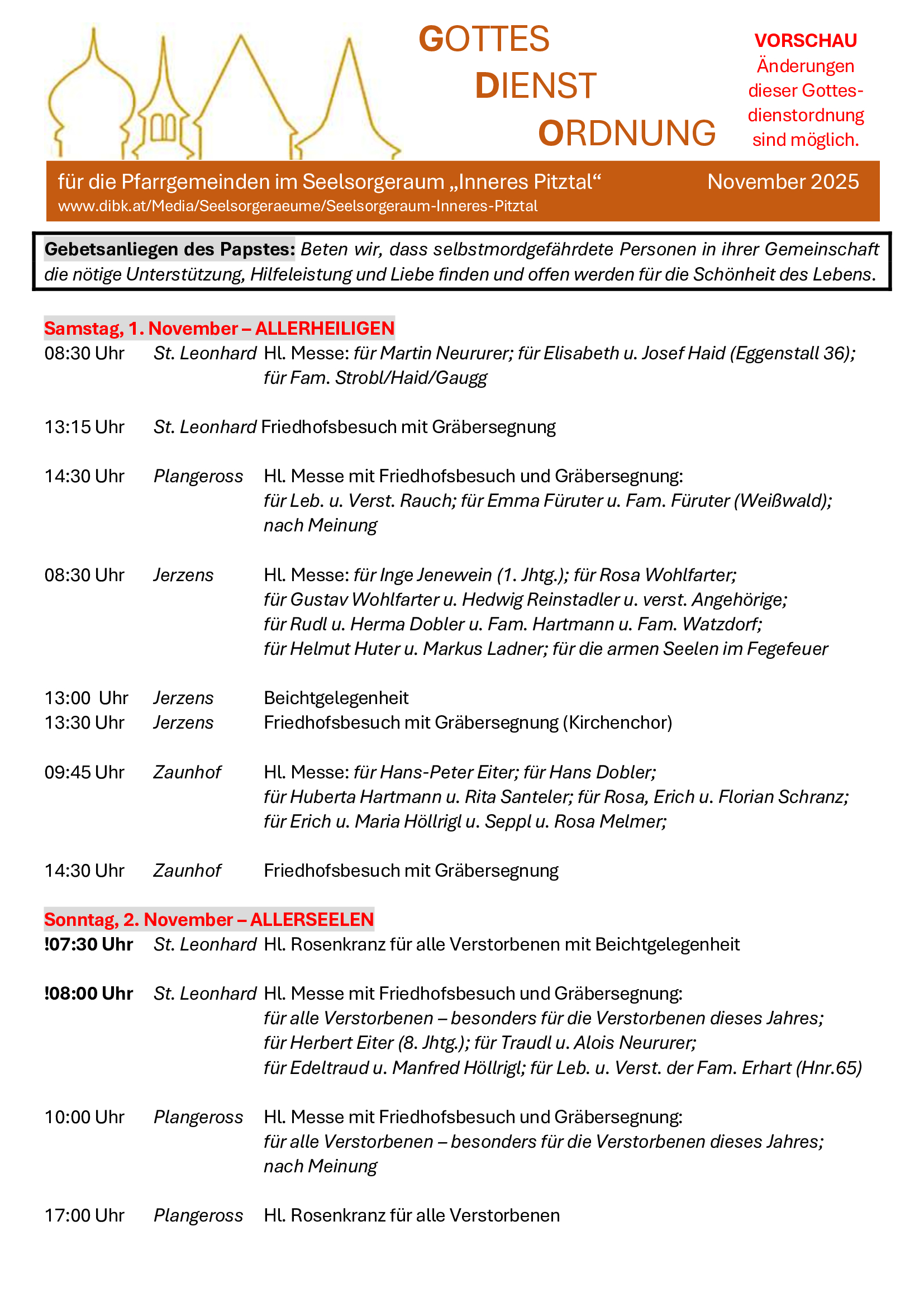 Die vier Kirchengemeinden des inneren Pitztals sind momentan auf dem Weg: auf einem Weg, der noch mehr das Zusammenleben, das Zusammenfeiern, das Zusammenglauben erlebbar machen möchte, ganz einfach deshalb, weil sich kirchliches Leben auch bei uns in den letzten Jahren sehr verändert hat und sich noch mehr verändern wird. Als Seelsorgeraum versuchen wir eine momentane Antwort auf diese strukturelle, den veränderten Lebensgewohnheiten angepasste, Veränderung zu geben.